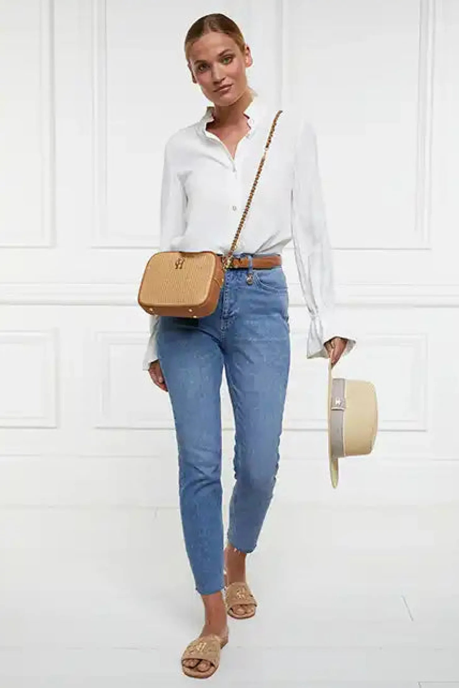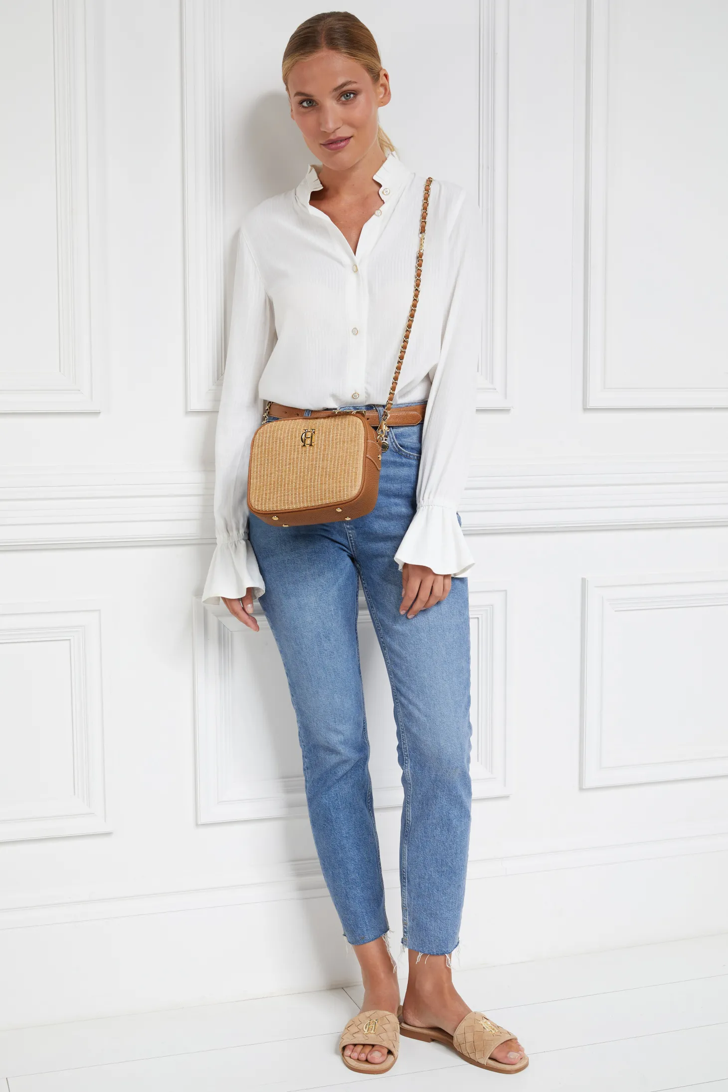 Our latest slide is all about comfort and style. With a cushioned sole, soft suede basketweave strap and eye-catching cut-out details, it's easy on your feet. The signature HC Monogram and gold rivets add a touch of flair. Simple, yet stylish – perfect for any occasion. Size & Fit Take your normal size Sizes 5-11 U
