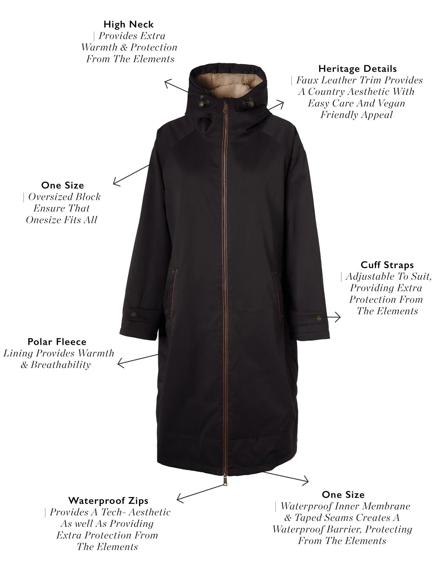 A must-have for the discerning adventurer, this super oversized coat boasts over-knee length for maximum coverage, ensuring you stay stylish and protected in any weather. Crafted with a waterproof outer shell fabric and fully taped waterproof seams, the full zip closure and cuff adjustment provides both functionality and versatility. With a borg lined hood with welt pockets to the front, the faux leather piping enhances this practical piece.