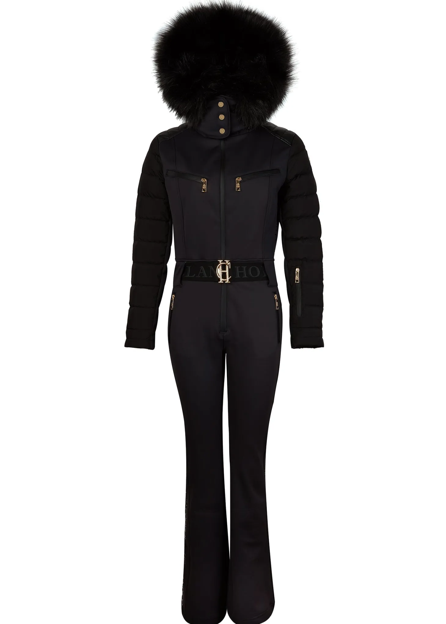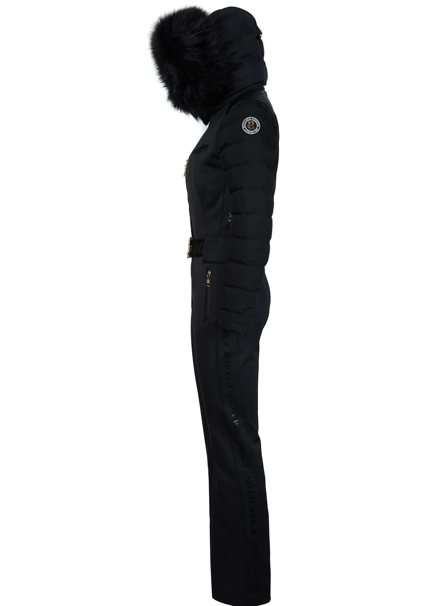 Make a statement on the slopes this season with our first ever Ski Suit. Designed with a four way stretch, this suit has been created to be both water and snow resistant whilst ensuring its still breathable and quick drying. With responsibly sourced down filling the sleeves for warmth, the luxurious faux fur trimmed hood is detachable and cosy. Offering maximum comfort thanks to its underarm vents, this jumpsuit also features adjustable vented zip hems to fit over any boots. This jumpsuit also features a lower cuff pocket for you lift pass, silicone branding and a chic waist-belt with gold HC fastening.